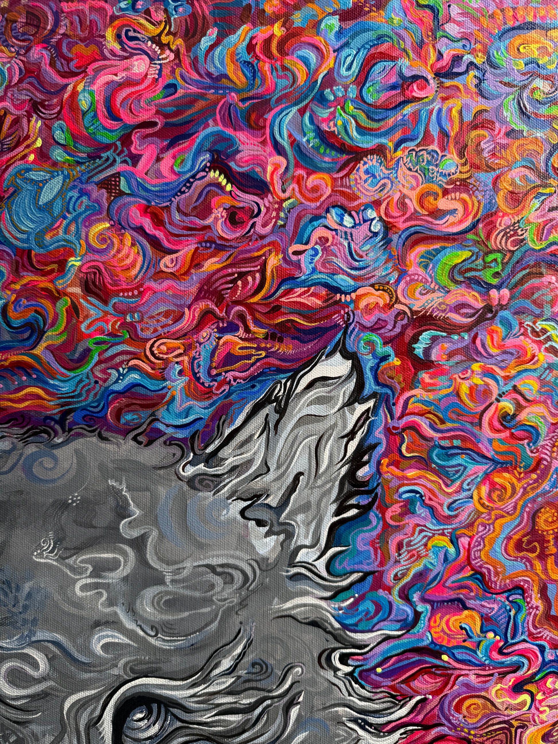Fear will always guard the thresholds, but on the other side waits freedom, magic, and creative power, depicted by the swirls of color surrounding the grey wolf.