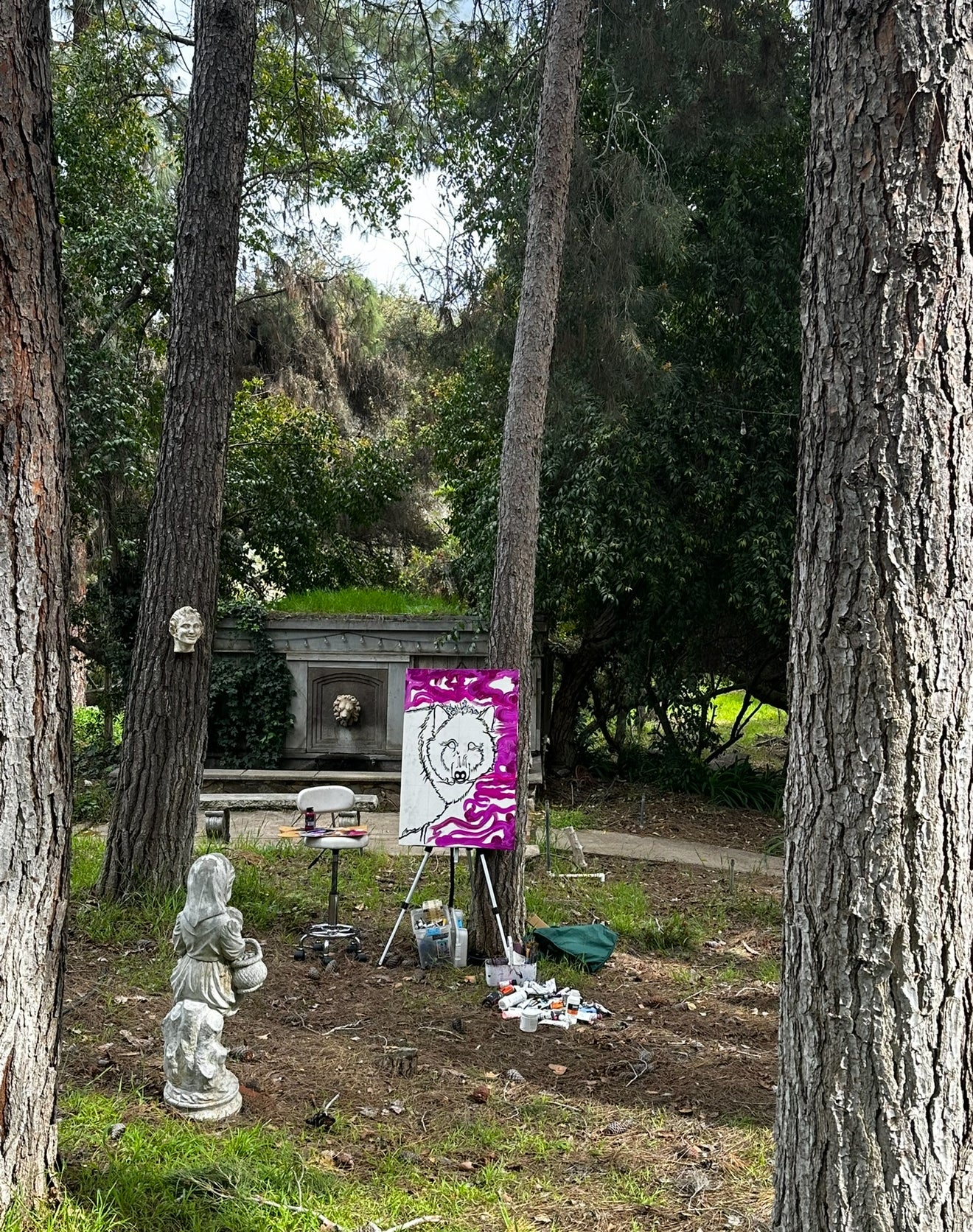 I set up my canvas in a fairy ring beside the main house, near a fountain and towering trees, compelled by an intuitive pull that this was the spot to paint. The perma-residents passing by giggled and remarked on my bravery for painting within the fae ring. I considered the possibility of mischief but trusted that magic was meant to infuse itself into my work there. I could have allowed fear or superstition to hold me back, but instead I opened myself to the mystery, welcoming the possibility that something ancient and whimsical may well seep into my creative flow that day, and it did ;)
