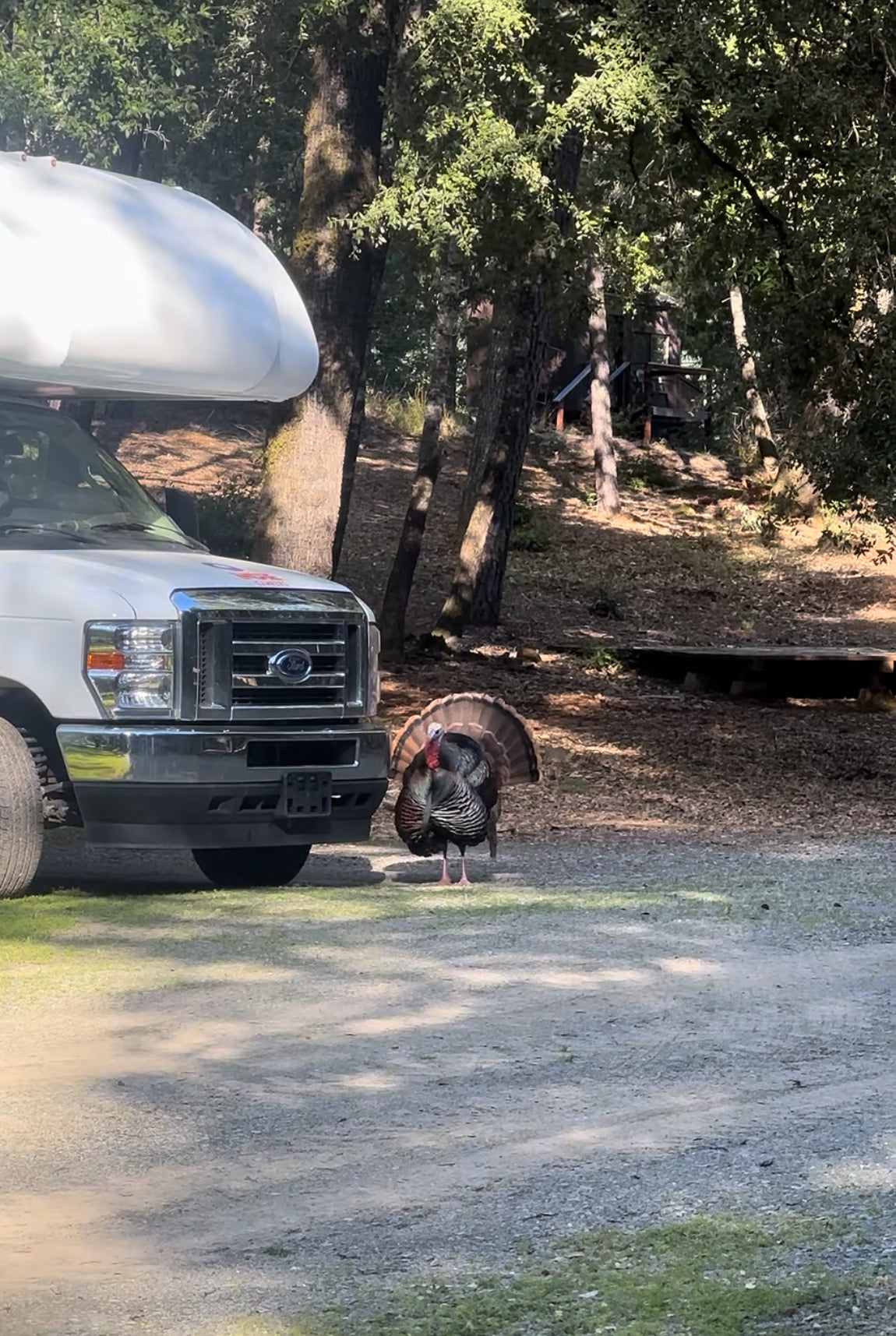 My voyage continued and a few days later I found a camping spot on an immaculate property that typically hosted Buddhist meditation retreats. It was the middle of the week and I was completely alone on the land aside from the grounds keepers and a number of seemingly belligerent wild turkeys. It was incredibly serene near the redwood forests. As I sat down to paint about 30-feet away from my camp, a turkey began charging my vehicle! He puffed up his feathers and repeatedly smashed himself into the RV. I was so perplexed as to why, and later realized that the turkey was battling his own reflection in the metal of the bumper. What could this mean? I decided that the scene was mirroring for me the lesson that fear and defensiveness often rises not from reality, but from illusion.