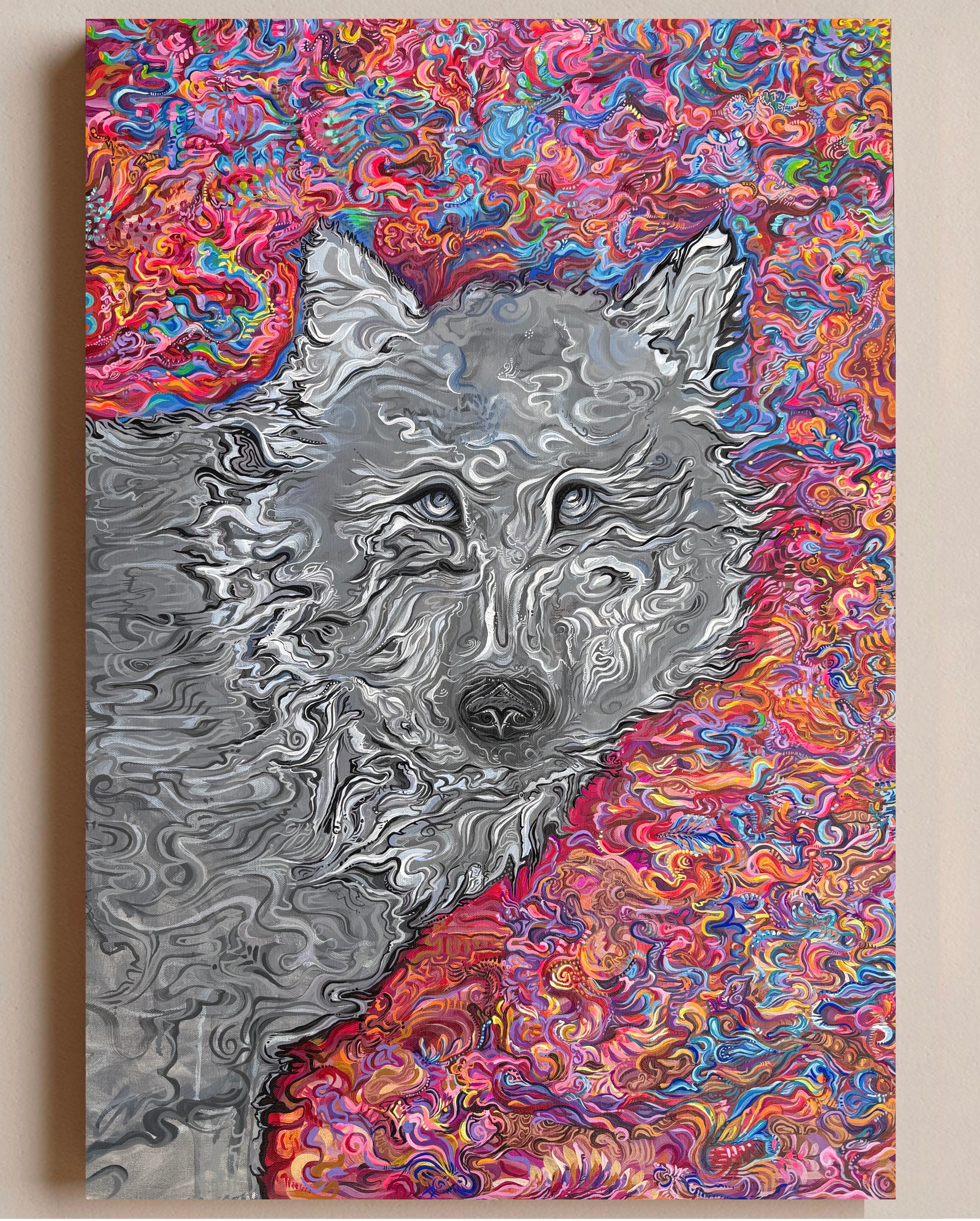 This wolf first appeared to me in a dream in 2022. In the dream I was anxiously pacing back and forth as a bear tried with all of its might to get into my cabin when I noticed shattered glass on the floor. I glanced up to investigate the source and saw a window, broken in from the outside. I swiftly turned around and locked eyes with a lone grey wolf. The wolf spoke to me and said, “I am going to teach you how to not be afraid.” I woke up instantly, permanently imprinted with this encounter.