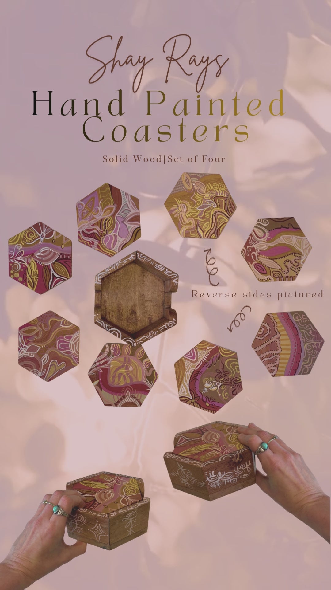 These four coasters are hand painted on both sides, fully reversible, and made from upcycled solid wood. Each piece is a tiny altar of its own, created with intention, artistry, and a little bit of my personal magic.