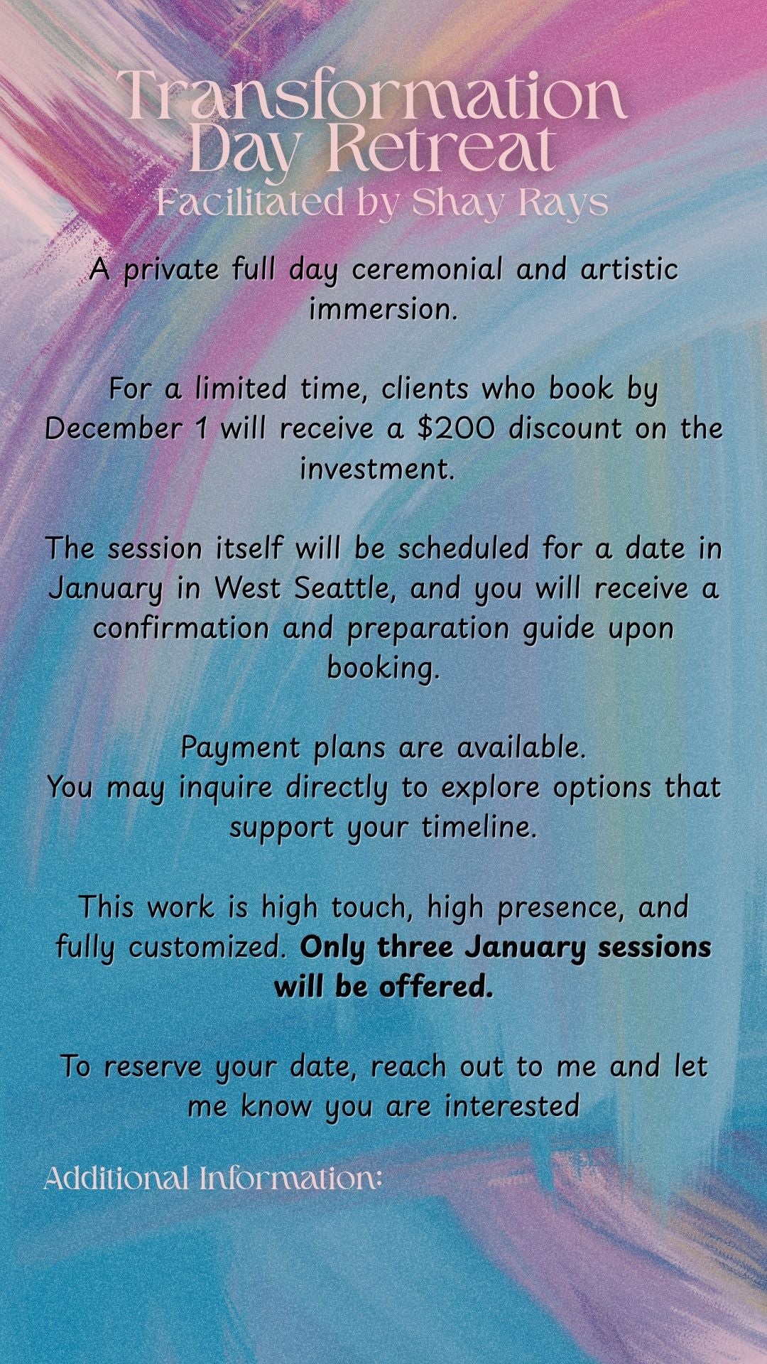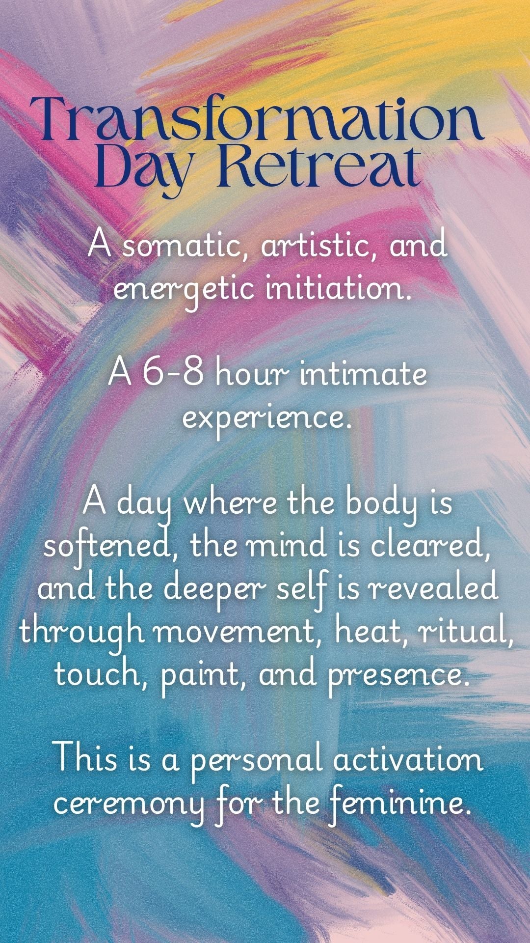 This Transformation Day Retreat is for the woman who feels a new version of self rising within her, your power and empowerment have shifted an octave. You can feel the next version of you gathering at the edges, ready to drop in once additional layers of density are cleared. You feel it, you're anchoring in expansion and this experience was created that transformation to fully land.